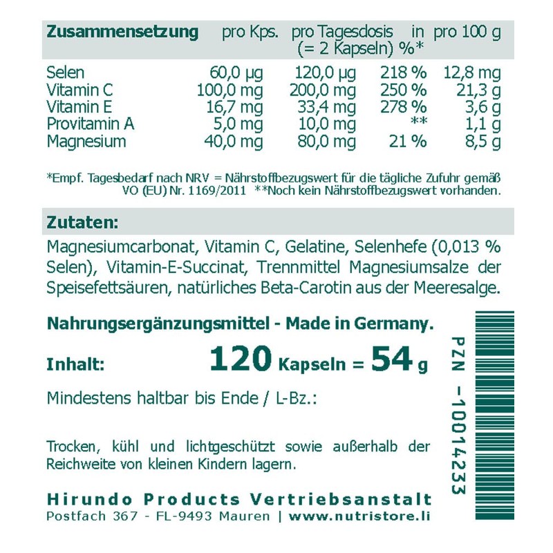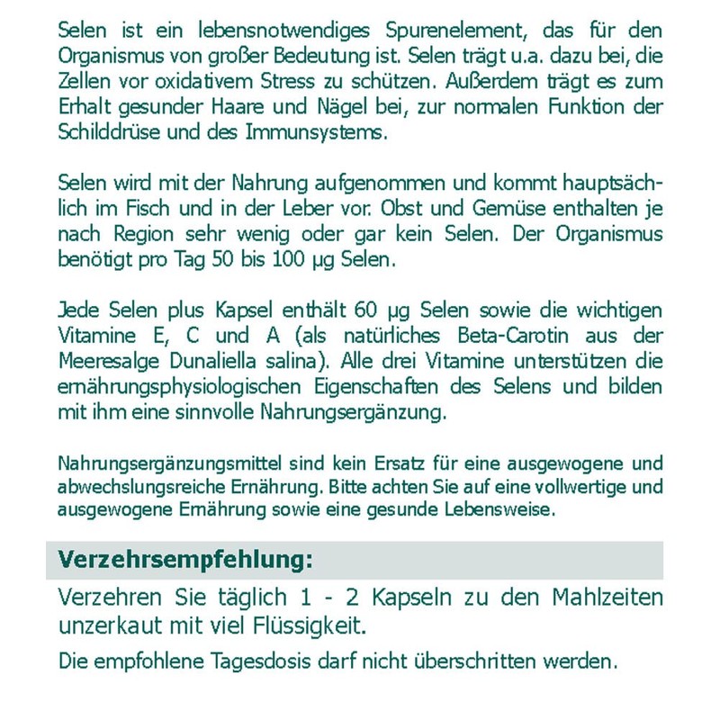 Each selenium plus capsule contains 60 μg selenium as well as the important vitamins E, C and A (as a natural beta-carotene from the seaweed Dunaliella salina). All three vitamins support the nutritional properties of selenium and form a useful dietary supplement.