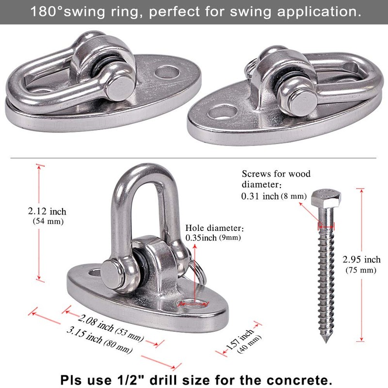 - ALL SWING HARDWARE MADE OF SUS304 FOOD GRADE STAINLESS STEEL OF 100% PERMANENT RUST, INDUSTRIAL BUILT HIGH QUALITY swingset hangers, perfect swing set brackets for all swing set products indoors or outdoors including porch swing springs ceiling or wooden mounts, gymnastics rings and hanging aerial yoga inversion trapeze swings seats
