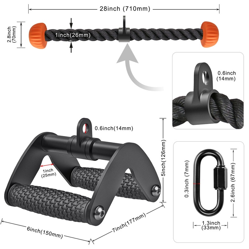 - 【STURDY AND DURABLE TRICEPS ROPE ATTACHMENT】This triceps rope attachment is made of woven black nylon with soft and durable rubber reinforcements on both ends for better grip and less calluses. The swivel attachment connects smoothly to universal fitness systems, cable machine, or pulley systems and more