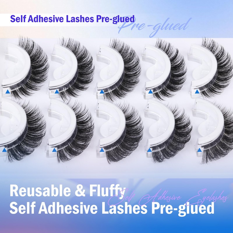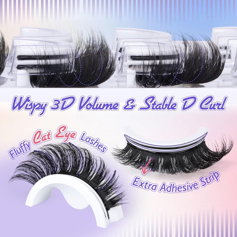 - 【No Glue Needed Eyelashes with Extra Self Adhesive Strips】 Say goodbye to mess of traditional glue on lashes! Elevate your natural lashes look with our soft, stick on lashes that attach to your eyelids with a gentle press. Each fluffy reusable self-adhesive false eyelashes has an additional adhesive strip as a replacement for added longevity. Our reusable pre-glued lashes can skip hassle of messy glue and achieve salon-grade eyelash extensions at home by yourself
