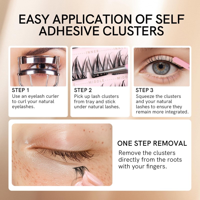 - Comfortable & Long-lasting: The upgraded self-adhesive cluster lashes have increased stickiness, and the adhesive strips are thinner and more invisible. It can last for more than 24 hours, so there's no need to worry about it suddenly falling. Made of high-quality materials, lightweight and soft. Even if you wear it all day long, you won't feel any burden.