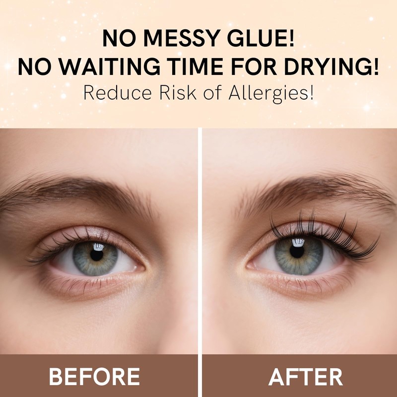 - Save Time & Effort: The glue-free eyelashes reduce the application steps when applying eyelashes, greatly shortening the time. There will no longer be a situation where glue adheres haphazardly to the eyes. Even beginners can handle it with ease.