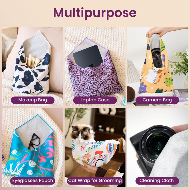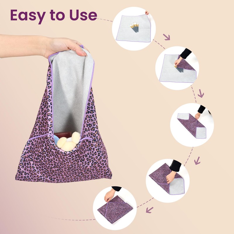 Self-Adhesive Magic Cloth,Portable Cosmetic Bag,Multi Purpose Reusable Travel Storage Bag,Camera Lens Protector,Protective Cover Laptop Sleeve,Folding,Washable(21.7" X 21.7",Purple Leopard Print)