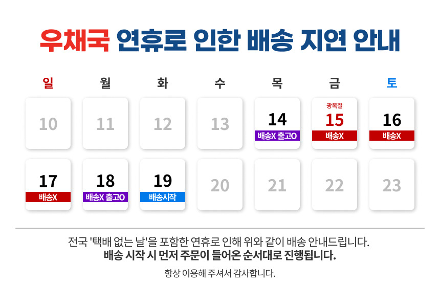 본 제품을 구매하시면 원활한 배송을 위해 꼭 필요한 고객님의 개인정보를 (성함, 주소, 전화번호 등) 택배사 및 제 3업체에서 이용하는 것에 동의하시는 것으로 간주됩니다.