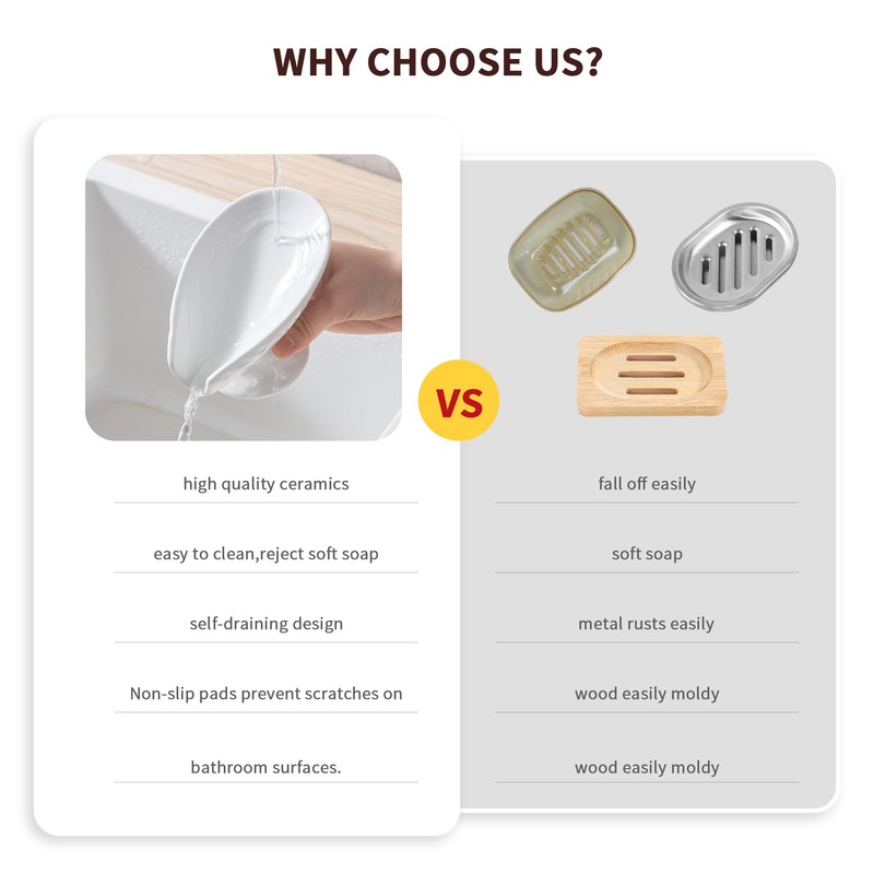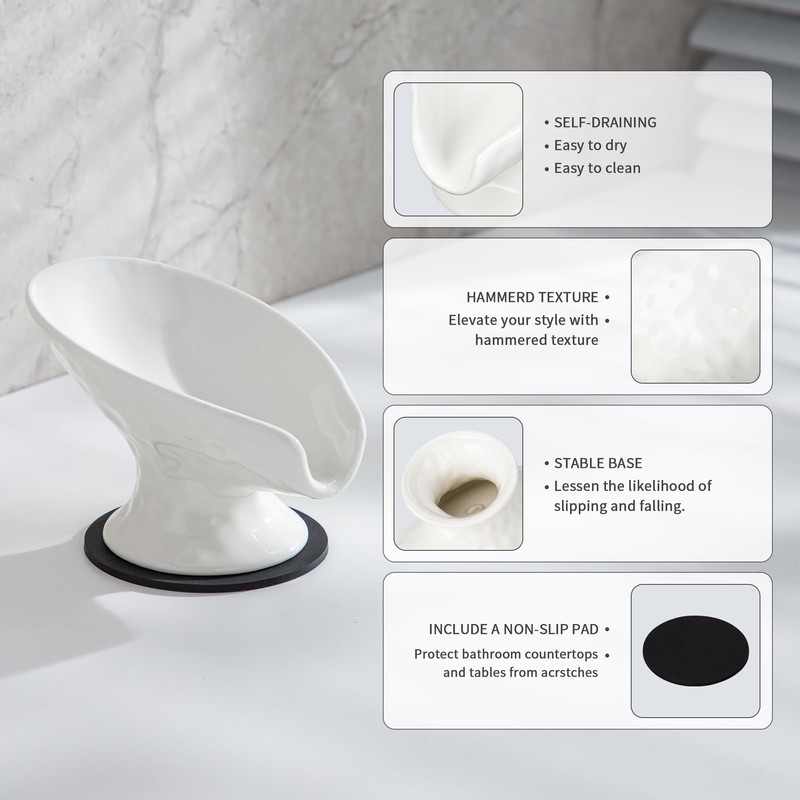 - Self-Draining Soap Dish:Our ceramic soap dish features an innovative self-draining system with a 45° oblique design for efficient water removal and quick drying. Save soap, reduce waste, and enjoy long-lasting freshness.