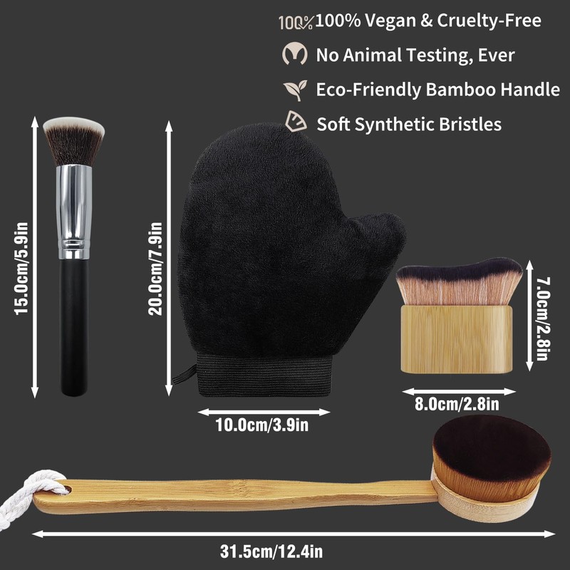 - ✅ Complete 4-In-1 Self Tanning Applicator Kit for Flawless Glow Everything you need for a salon-quality tan at home! This body makeup brushes includ a large kabuki brush for self tanner, a long-handle back applicator for lotion and hard-to-reach areas, a precision face tanning brush for self tan, and a soft self tanner mitt for blending and buffing.