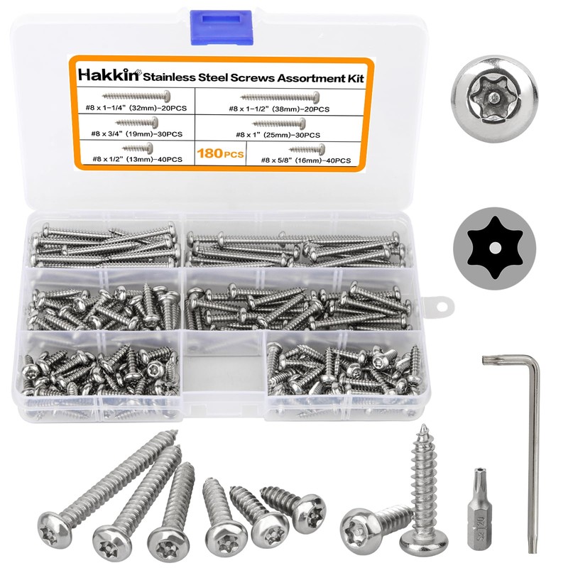 Self Tapping Screws Hakkin 180Pcs M4#8 Button Head Torx Security Screws Sheet Metal 304 Stainless Steel Anti-Theft Tamper Proof Screws Assortment Kit with T20 Wrench