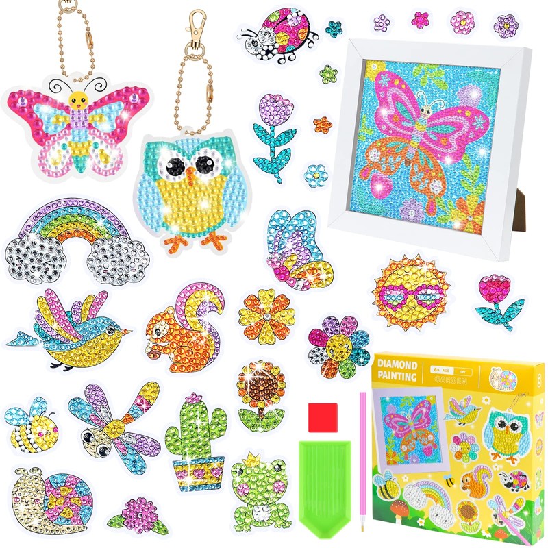 - Diamond painting children's set: includes 1 diamond canvas, 1 wooden frame, 2 diamond painting key rings, 25 diamond painting stickers, 1 diamond painting pen, 1 gemstone tray, 1 wax square, enough colourful gemstones, including gift box. The best kit for crafting with children.