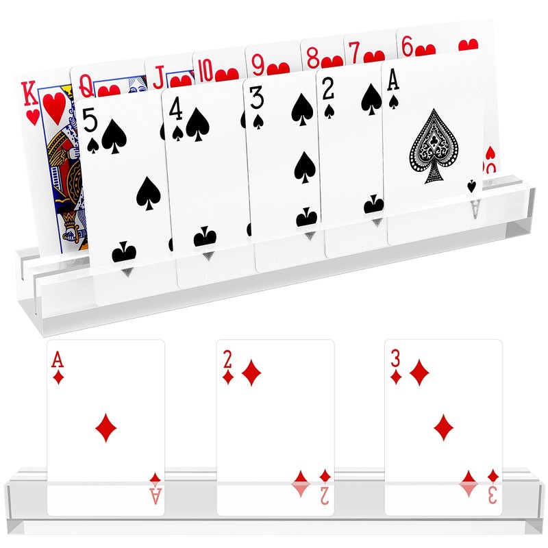 - Card holder playing cards: - 2 pack acrylic playing card holder, size: L25 x W3.5 x H2.5 cm. The height difference design makes it easy to see all cards. Gifts for card players, children and the elderly. Ideal for all card games.