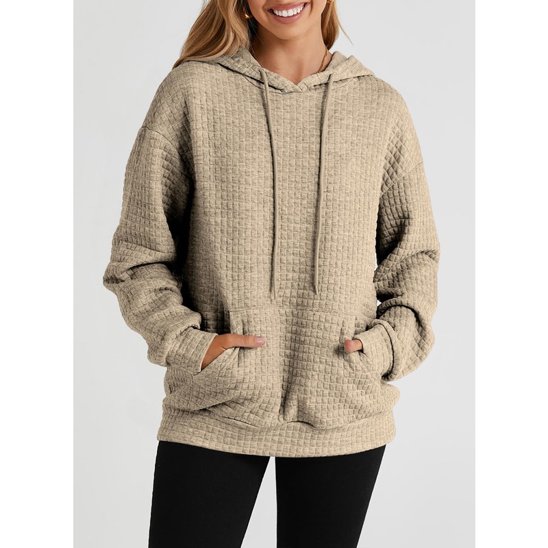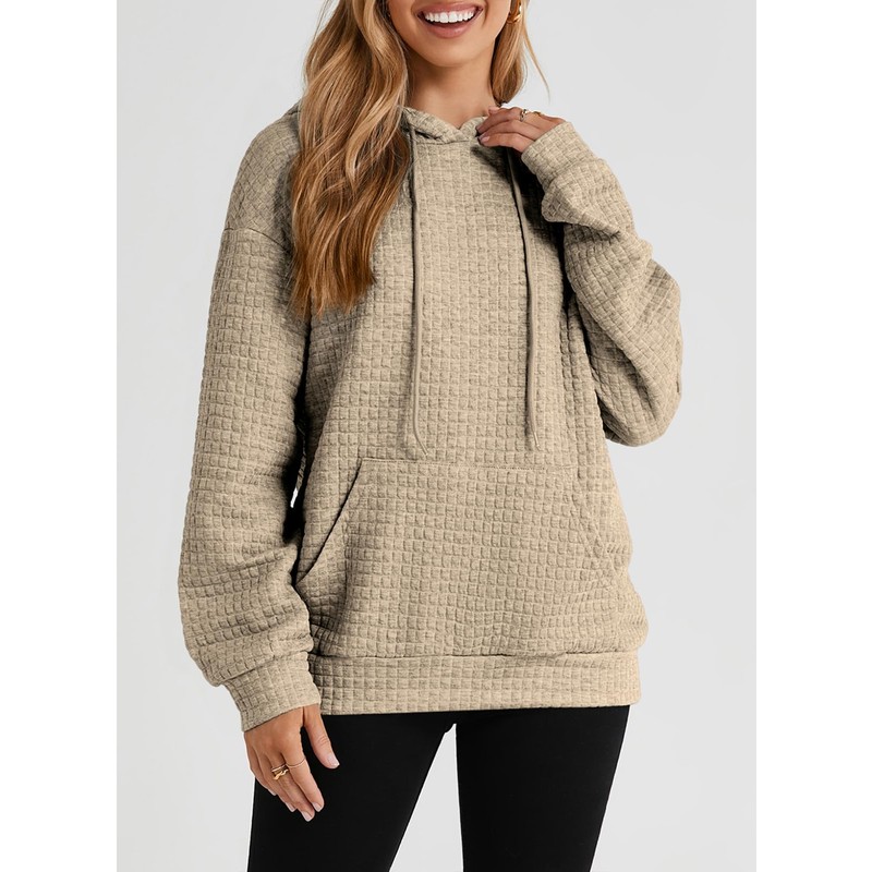 SELINK Hoodies For Women Casual Pullover Waffle Long Sleeve Drawstring Hooded Sweatshirt with Pocket Khaki-XXL