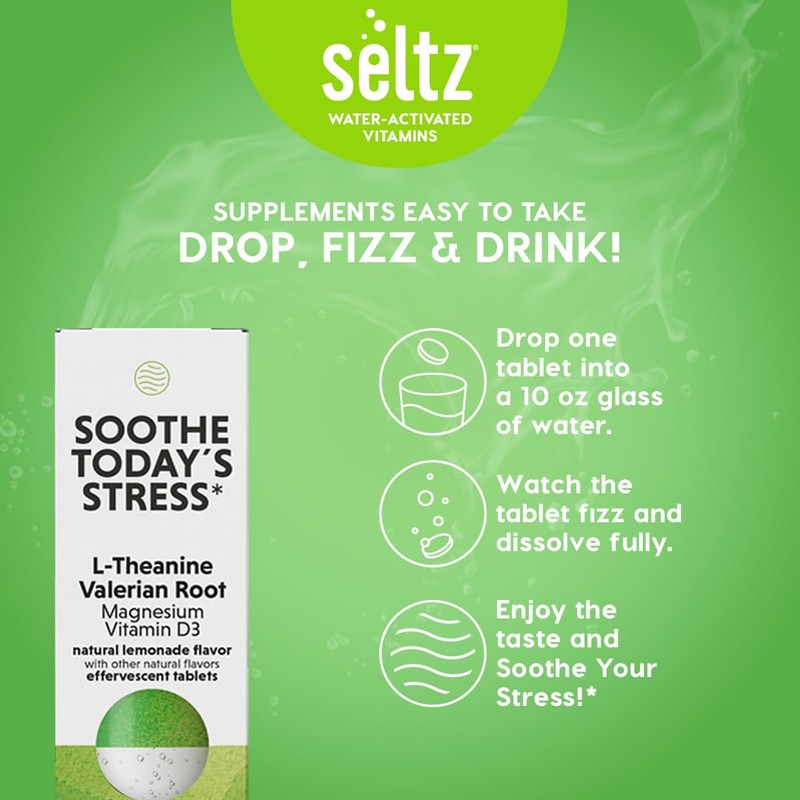 - - HOW TO USE: Drop, fizz, and drink. Seltz water-activated vitamins dissolve into a tasty, daily drink that delivers essential nutrients.* 1. Drop one tablet into a 10oz glass of water 2. Watch the tablet fizz and dissolve fully 3. Enjoy the taste and Soothe Today's Stress!