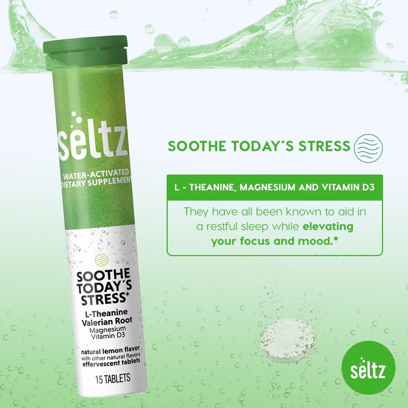 Seltz® Water-Activated Vitamins - Soothe Today´s Stress with L-Theanine, Magnesium, and Vitamin D3 – Natural Lemonade Flavor Dietary Supplement - 6 Packs x 15 Effervescent Tablets Each