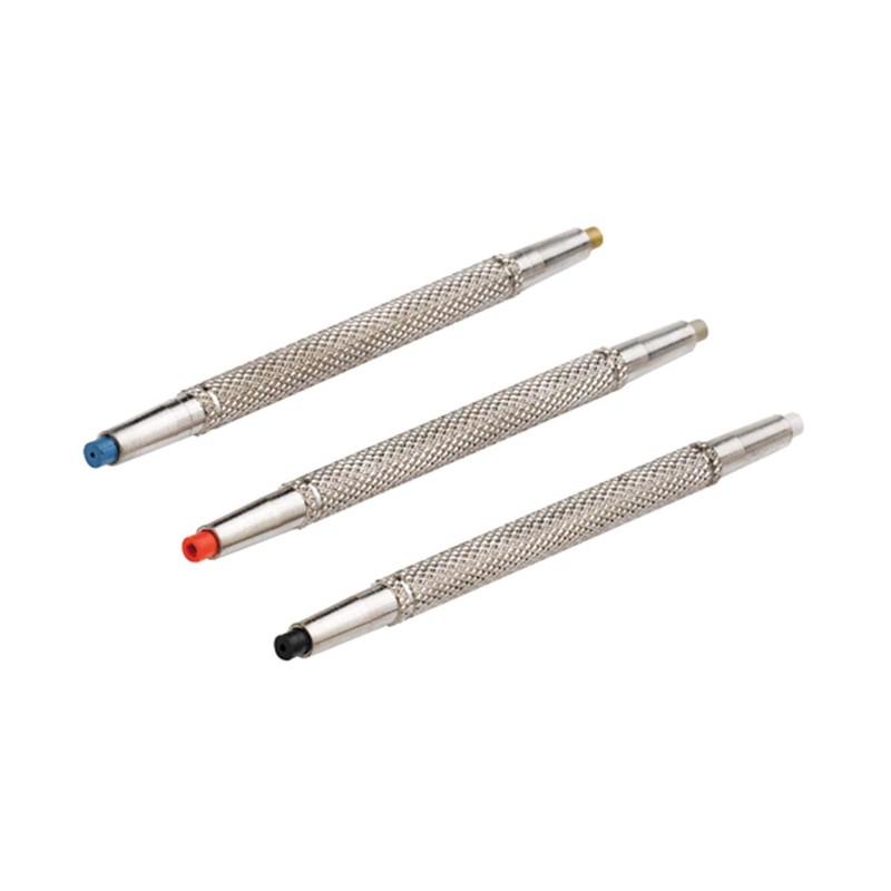 - Included in the set: 0.50 and 1.00 mm (white and black); 1.50 and 2.00 mm (grey and red); flat and 0.80 mm (brass and blue).