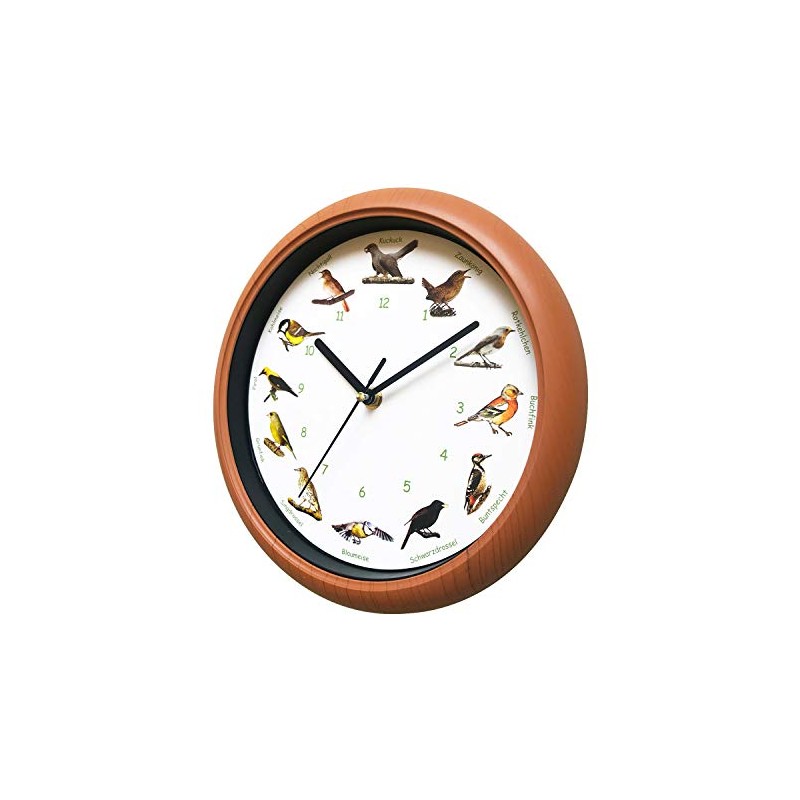 SELVA Animal Clock Wall Clock with Animal Sounds at Every Hour and Colourful Illustrations, Plastic Case, Wood Look, Colour: Songbirds
