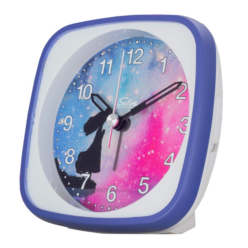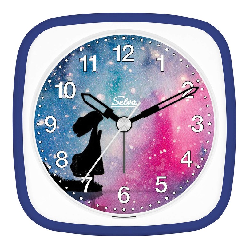 SELVA Kinderwecker Sternenhimmel mit Motiven. Schleichende Sekunde lautlos, analog, für Kinder, buntes Zifferblatt mit Licht/Weckwiederholung. Maße: 95 x 95 x 45 mm (Sternenblick)