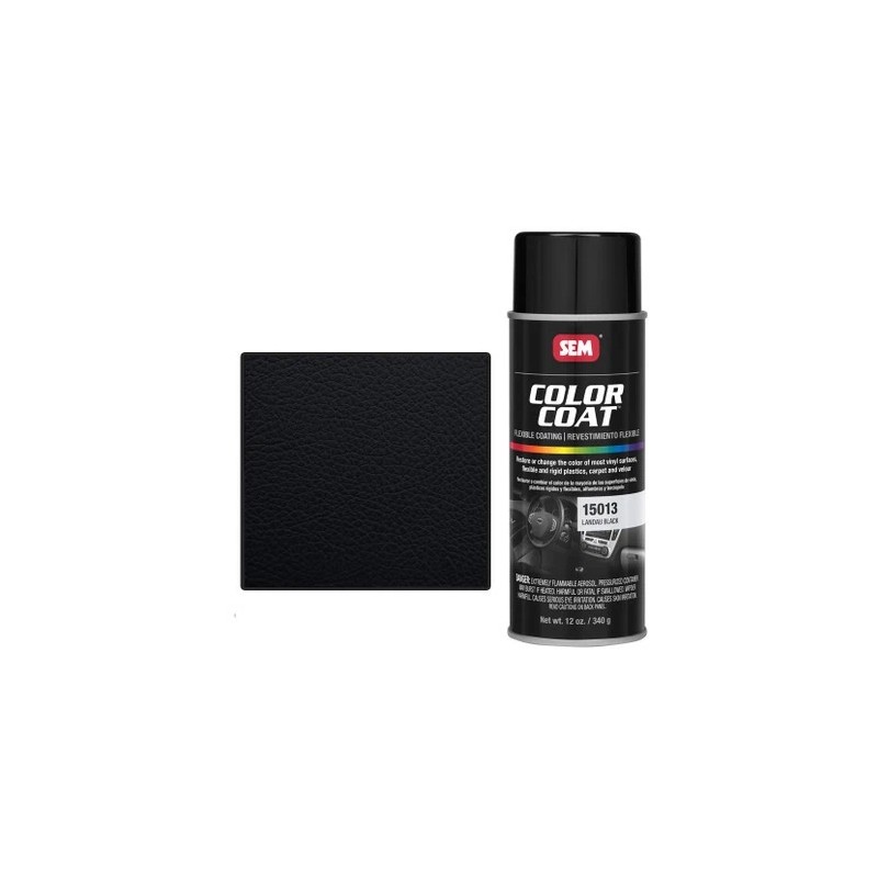 The SEM 15013, Landau Black car interior paint is designed to restore or change the color of vinyl, carpet, properly prepped and primed metal, velour, and plastic. It is used to refinish vehicle interiors and motorcycle seats. All Color Coats are very simple to use and quick to dry. They are very elastomeric and will not crack.