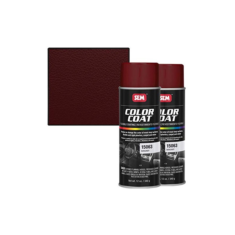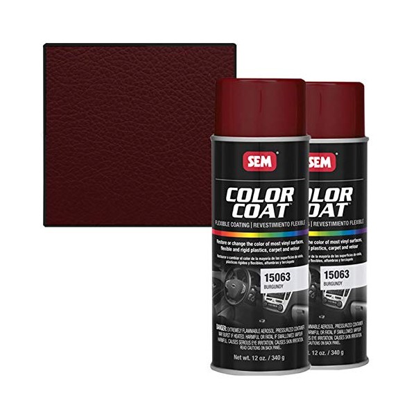 (2) 12 oz Aerosol Can Covers Approximately 10 square feet The SEM 15063, Burgandy Vinyl Paint, Color Coat is designed to restore or change the color of vinyl, carpet, properly prepped and primed metal, velour, and plastic. It is used to refinish vehicle interiors and motorcycle seats. All SEM Color Coat colors are very simple to use and quick to dry. They are very elastomeric and will not crack. SEM Color Coat Surface Preparation: Clean, Clean, Clean!!! I can't stress enough how the surface being sprayed must be Very clean!! Use Hot Soapy water wherever you can. Using SEM 39362 SEM Soap scrub the surface and rinse with water. Blow dry or towel dry then clean the surface with SEM 38343 Vinyl Prep or SEM 38353 Plastic Prep. If the surface isn't clean the product won't stick. For plastic surfaces you will need to use a plastic adhesion promoter. SEM 39863 Flexible Bonding Clear or SEM 38363 Sand Free both work well. Apply per manufacturer instructions. Color Coat may then be applied in light even coats. Several light coats work, with 5-10 minutes between coats, much better than one heavy coat. For added protection or change of sheen, apply one of Sem's clear coats. SEM 13003 High Gloss, SEM 13013 Satin Gloss, or SEM 13023 Low Luster. Product will be dry to touch in approximately 10 minutes. The substrate should not be subject to heavy abuse or abrasion for a 24 hour period minimum.