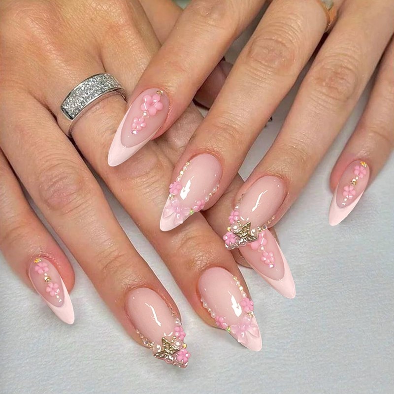 SEMATA Light Pink French Tip Press on Nails Almond Medium Acrylic Fake Nails Press Ons with Glue Flower Butterfly Cute Stick on Nail with Designs Rhinestone Bow Artificial Glue on False Nail for Women