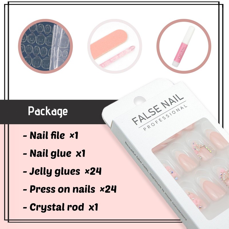 - 【Package Content】 You will get 1 box with 24 pieces of press on nails, and it comes with alcohol pads, nail tip glue, adhesive nail taps, double-sided nail file, and Disposable nail Cuticle stick. Please note that due to screen display issues, the color of the actual product you receive may be slightly different.