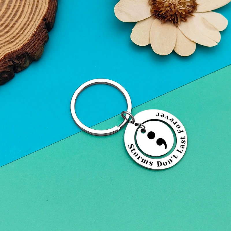 - Mental Health Awareness Gifts - “Storms Don't Last Forever”with a Semicolon charm. The semicolon is representative of a powerful movement aimed at bringing awareness to depression, suicide prevention, self harm, and mental illness awareness.This keychain can constantly remind people to get through bad experiences and get encouragement again.