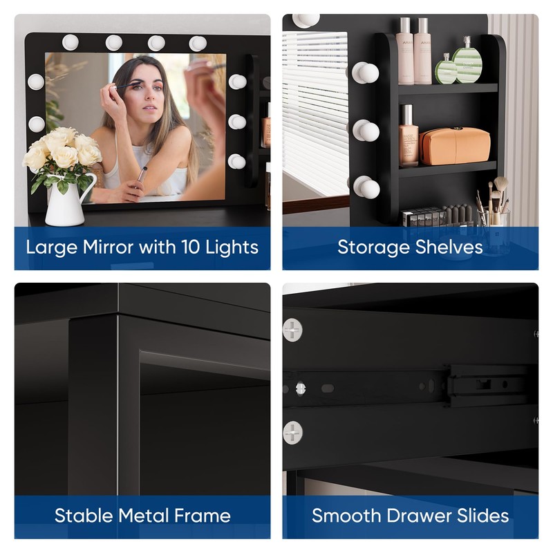 - 👑【Makeup Vanity with Lighted Mirror】The makeup desk with drawers is equipped with a large mirror with 10 LED bulbs that provide you with super-bright lighting, so you can experience the star-like makeup treatment, that will reflect your appearance more clearly and realistically. These glam bulbs create a perfect lighting for applying makeup and hairstyling.