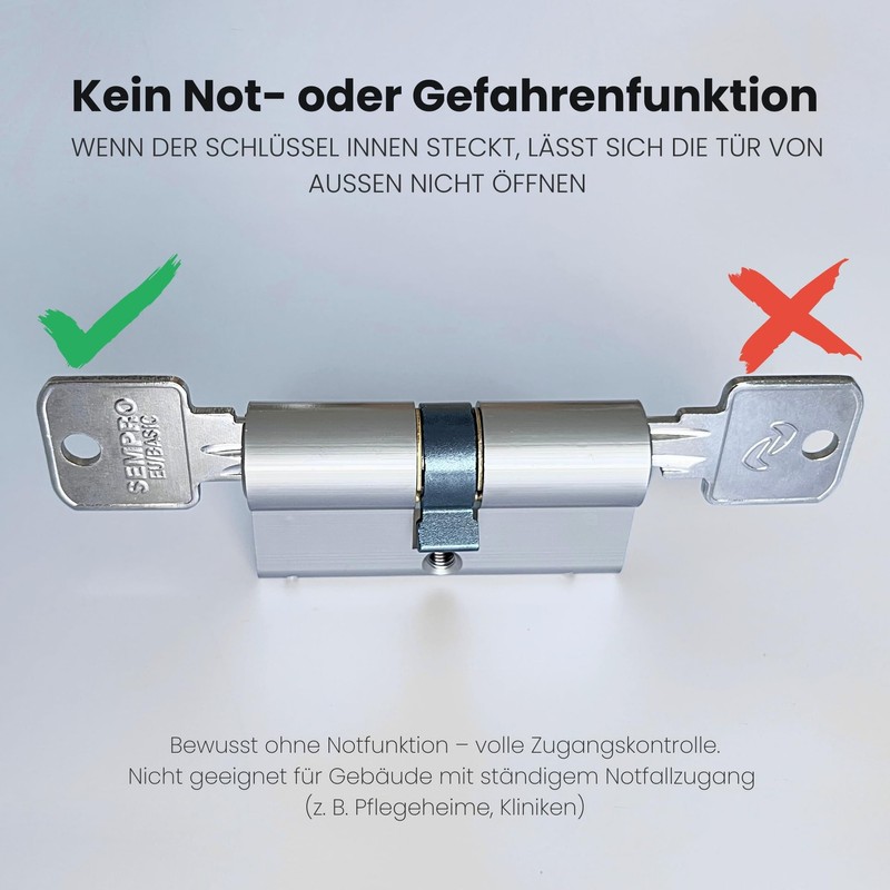 - NO EMERGENCY OR DANGER FUNCTION - If a key is inserted inside, the door cannot be opened from the outside. Not suitable for buildings with permanent emergency access (e.g. nursing homes, clinics).
