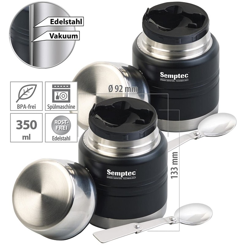 - 2 vacuum thermal cups each including foldable spoon and instructions in German. Thermal drinking cup - perfect for outdoors: keeps coffee, tea or soup warm for up to 8 hours