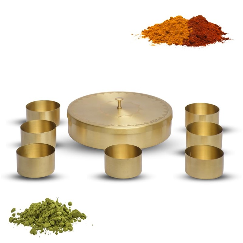 SEMPYIX HandCraft Brass Masala Box Set with Spoon Container 90 ML-Food Spice Storage Rack Indian Boxes Dani Dabba -kitchen (8-INCH)