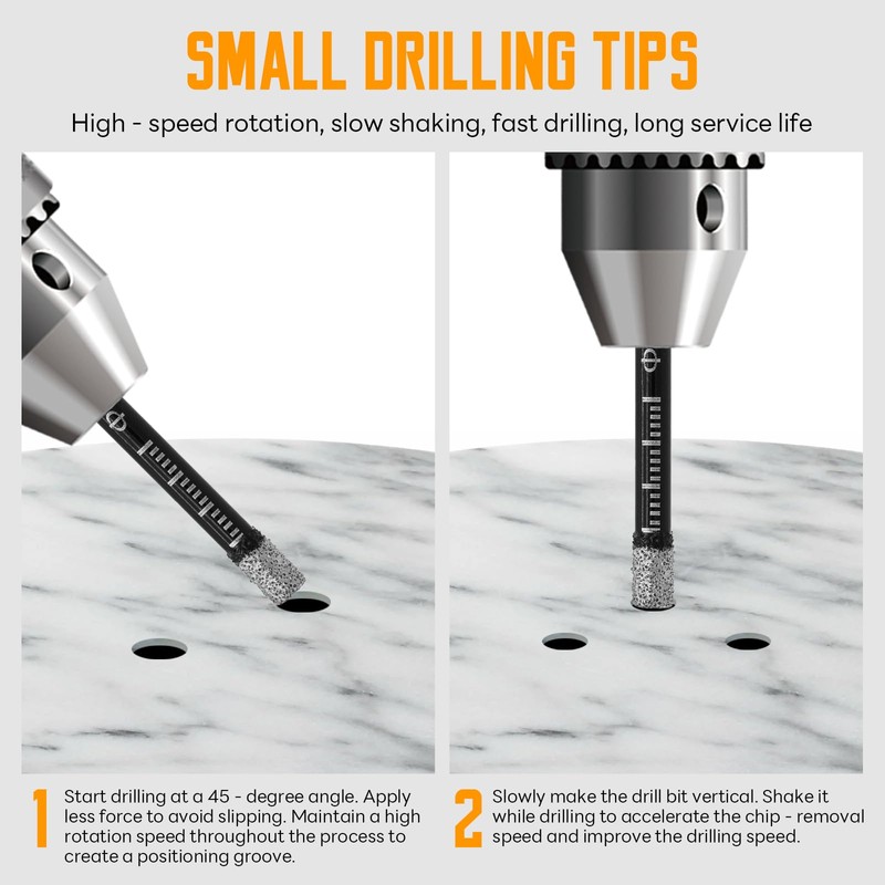 - Easy to Use: First make a cut at a 45 degree angle, then slowly drill vertically. By shaking the drill bit, the chip removal speed can be accelerated, thereby improving the drilling speed.