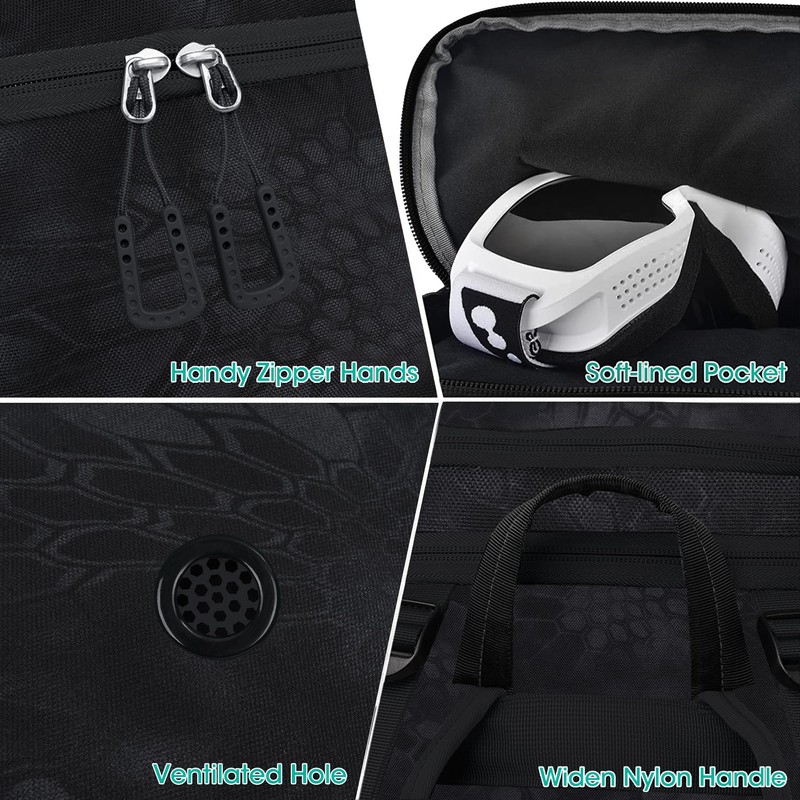 - Waterproof and Durable:840D Twisting Nylon Fabric makes the exterior waterproof, tear-resistance and scratch-resistance. The bottom of the ski boot bag backpack is well padded with waterproof and low temperature resistant tarpaulin, as well as 4 non-slip mat. No worries about the ski & snowboard boot bag will get wet and slip away when you put this bag on the ground.