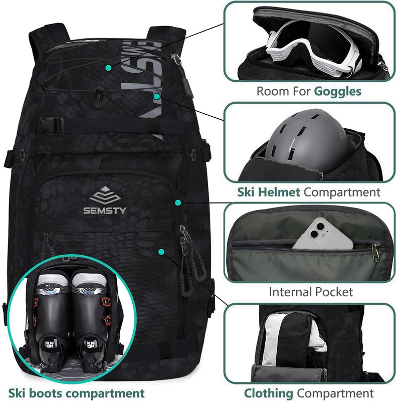 SEMSTY Ski Boot Bag, 55L Waterproof Ski and Snowboard Boots Travel Backpack for Skis, Snowboard, Ski Helmet, & Accessories