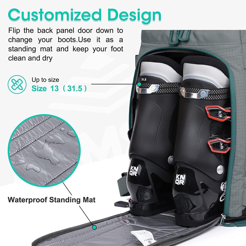- Waterproof and Durable:840D Twisting Nylon Fabric makes the exterior waterproof, tear-resistance and scratch-resistance. The bottom of the ski boot bag backpack is well padded with waterproof and low temperature resistant tarpaulin, as well as 4 non-slip mat. No worries about the ski & snowboard boot bag will get wet and slip away when you put this bag on the ground.