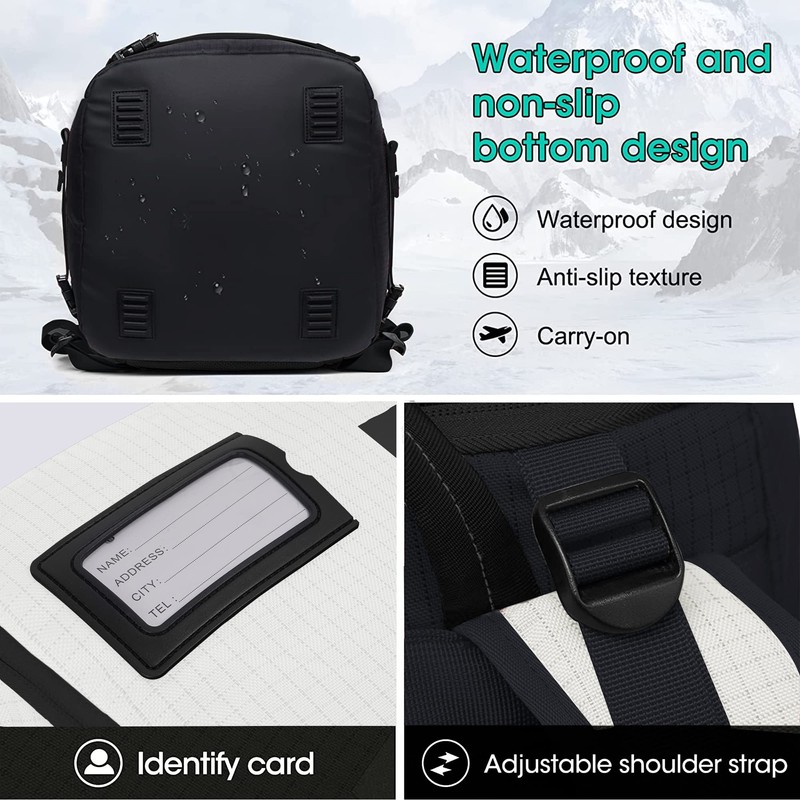 - Waterproof and Durable:840D Twisting Nylon Fabric makes the exterior waterproof, tear-resistance and scratch-resistance. The bottom of the ski boot bag backpack is well padded with waterproof and low temperature resistant tarpaulin, as well as 4 non-slip mat. No worries about the ski & snowboard boot bag will get wet and slip away when you put this bag on the ground.