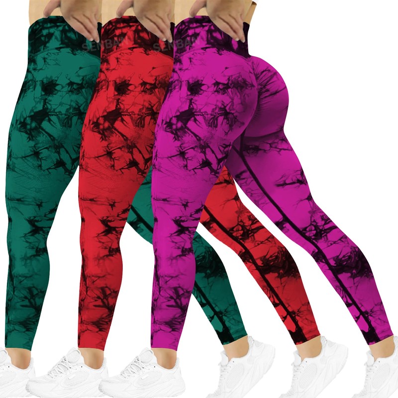 SENBAN Women Scrunch Workout Leggings: Butt Lifting High Waisted Yoga Pants - Tie Dye Seamless Booty 3 Pack Gym Leggings Green Red Rose S