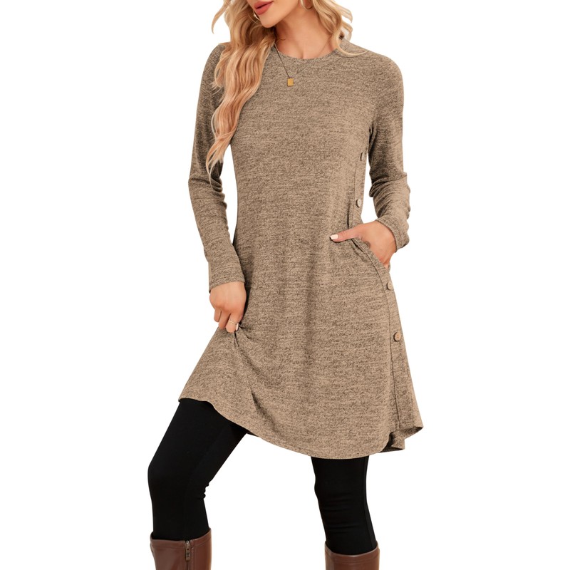 - FEATURES The winter dresses for women feature long sleeves, flattering tunic dress silhouette and sweater dress features, making them perfect for the colder season. They are equipped with comfortable pockets to keep your hands warm and store small things, and the side buttons provide cute details, making them stylish and always in fashion