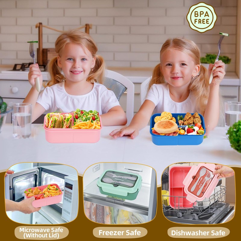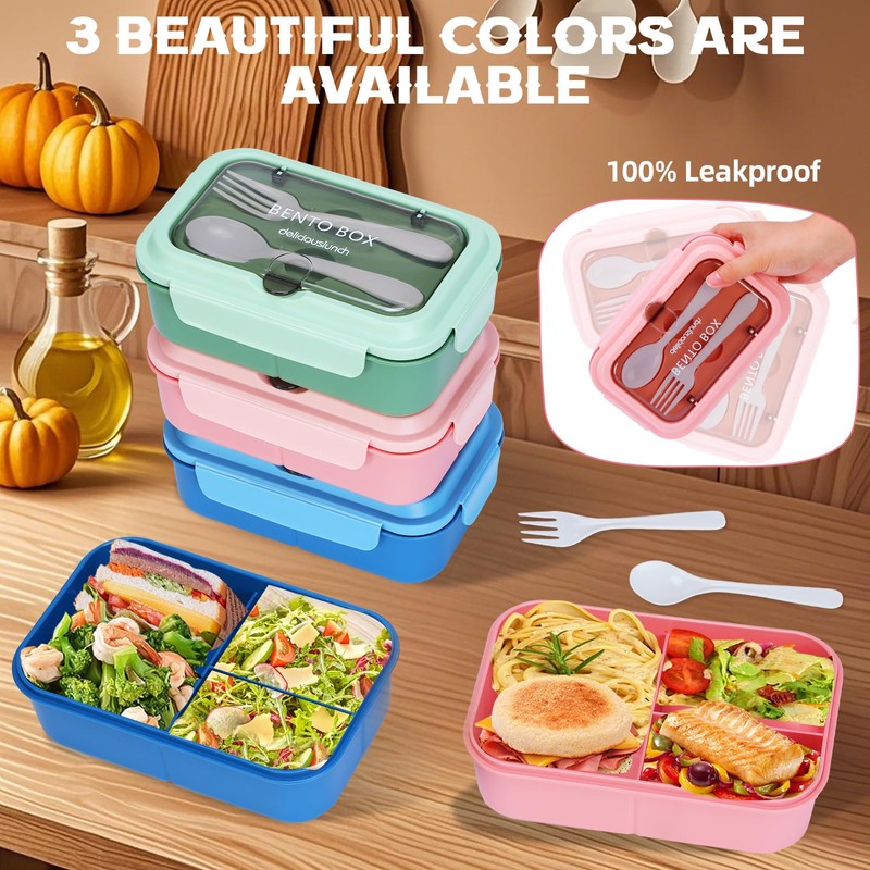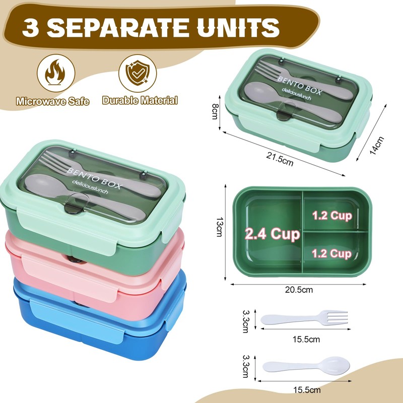 - Convenient Bento Box - The 3-compartment design keeps food neatly separated, preventing mixing. A fork and spoon are included, with a dedicated lid to store them securely. Perfect for school, office, or travel!