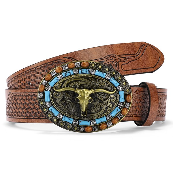 SENDEFN Western Cowboy Belt for Men Women Leather Longhorn Bull Buckle Belts ...
