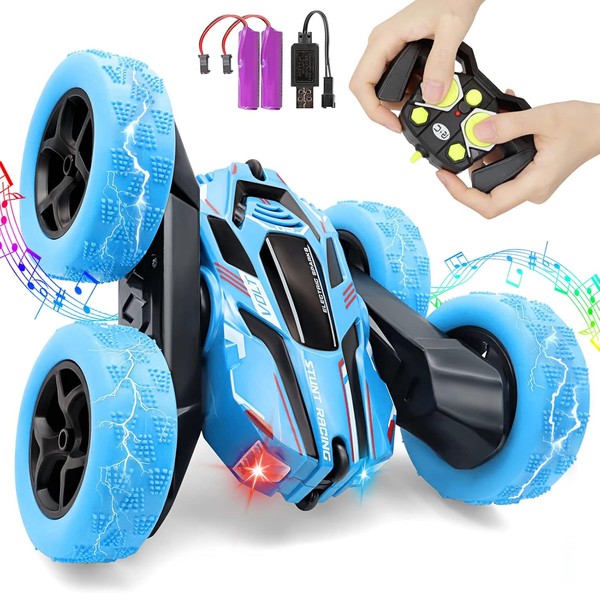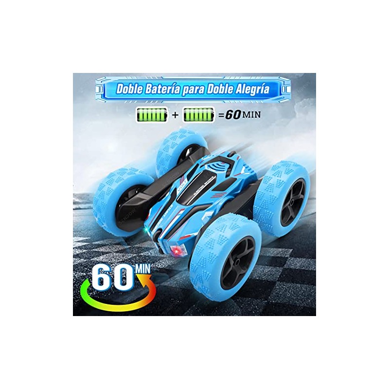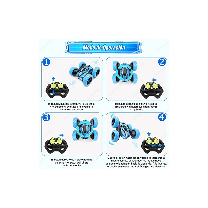 COCHE GIRATORIO DE 360°: Este coche RC puede girar 360 grados y conducir por los dos lados. Excepto para avanzar, retroceder, girar a la izquierda, girar a la derecha y derrapar, este automóvil de control remoto podría girar 360 grados horizontalmente y girar verticalmente como un baile. Por lo tanto, también podría ser una carrera de 2 lados al encontrar obstáculos en todas las direcciones, tanto en tierra como en el agua. ¡Maneja todo tipo de obstáculos y nunca disminuyas la velocidad! ALTA VELOCIDAD Y APROPIADO PARA TODO TERRENO: Este coche de control remoto de acrobacias RC está equipado con 2 potentes motores, que pueden atravesar fácilmente la tierra, la playa y el césped. Nuestro coche de acrobacias con música remota es perfecto para niños de 6 a 12 años y te proporcionará carreras realistas y una emocionante experiencia de juego todoterreno. APTO PARA TODO TERRENO: Este automóvil de control remoto está equipado con motores potentes y equipado con neumáticos de goma flexibles, está listo para la aventura en todos los terrenos, como césped, rocas pequeñas, arena, tierra suelta o caminos de concreto. Nuestros juguetes de control remoto para autos le brindarán a usted y a sus hijos una emocionante experiencia de manejo. COCHE TODOTERRENO A PRUEBA DE GOLPES: Este coche acrobático remoto está hecho de plástico ABS ambiental, diseñado con neumáticos duraderos antichoque y ruedas flexibles. Los autos de control remoto permiten una alta velocidad y una mejor flexibilidad, adecuados para jugar en interiores y exteriores. Con su construcción liviana y tamaño pequeño, este auto de carreras rc es fácil de llevar donde quiera que vaya. 2 BATERÍAS RECARGABLES Y 2.4GHZ: Los autos controlados por radio incluyen dos baterías recargables, cada batería puede ayudar a los niños a jugar con el auto RC durante 20 minutos. El coche de acrobacias adopta la tecnología de 2,4 GHz para soportar muchos vehículos de alta velocidad, larga distancia de control y buena capacidad antiinterferencias, adecuado para más coches jugando al mismo tiempo sin interferencia de señal. El control remoto requiere 2 pilas AA (no incluidas). FAROS LED Y CARACTERÍSTICAS DE MÚSICA: Los juguetes de control remoto para autos no solo tienen una excelente función de conducción, sino que también tienen luces y música geniales. Los coloridos faros y la maravillosa música de los autos RC crearán una diversión infinita para los niños mientras juegan. Este divertido juguete interactivo de carreras 4WD RC es un regalo perfecto para un cumpleaños, Navidad o cualquier festival.