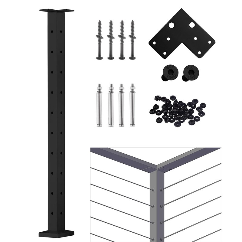 - 【STRENGTH & ELEGANCE】: Matte black finishing - Pre-drilled holes on surface with standard 3” distance. Design for invisible cable railing system. Steel post can be installed on steps and staircases for patio, balcony, porch, garden, residential building, commercial office building, hotel, garage etc.