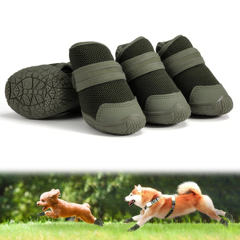 「SENMUUP」犬靴 犬用ブーツ ドッグシューズ 夜間反射テープ付 春夏用 軽量通気 メッシュ 抗菌防臭 吸水速乾 履かせやすい 脱げにくい 肉球保護 滑り止め 耐久性ゴム底 散歩 防水 介護 傷舐め防止 小&中型犬 5サイズ 4個セット (グリーン, 4#)