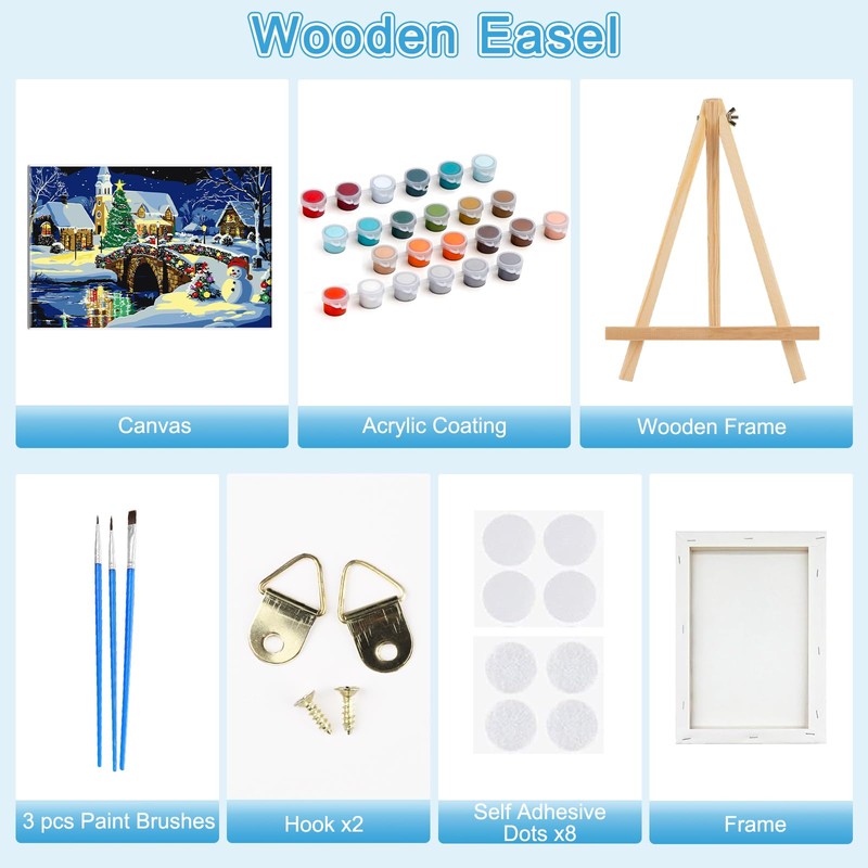 - HD Color Canvas and Wooden Framed: Canvas is a linen for a special use of painting by numbers, and painting for long periods of time doesn't strain the eyes.The canvas is framed (With Wooden Easel) so that it won't wrinkle