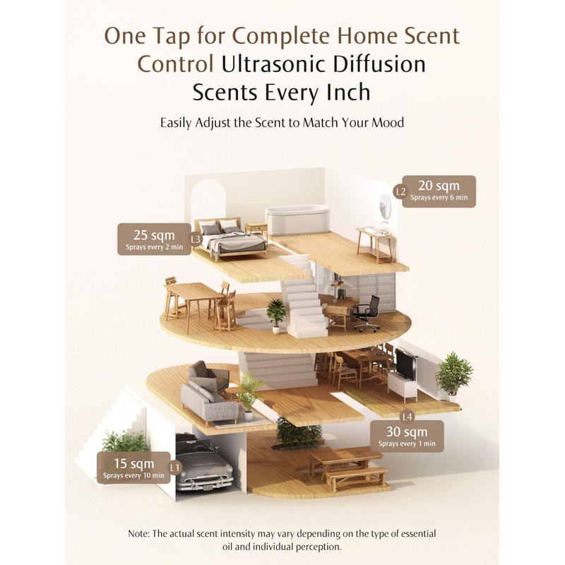 - Up to 1000 sq. ft. Fragrance Coverage: Effortlessly fill up to 1000 sq. ft. with captivating scent; just plug in for complete home fragrance control. With ultrasonic diffusion that reaches every corner, customize your ambiance with four adjustable scent intensity levels and spray intervals of 1, 2, 6, or 10 minutes for full, personalized control.