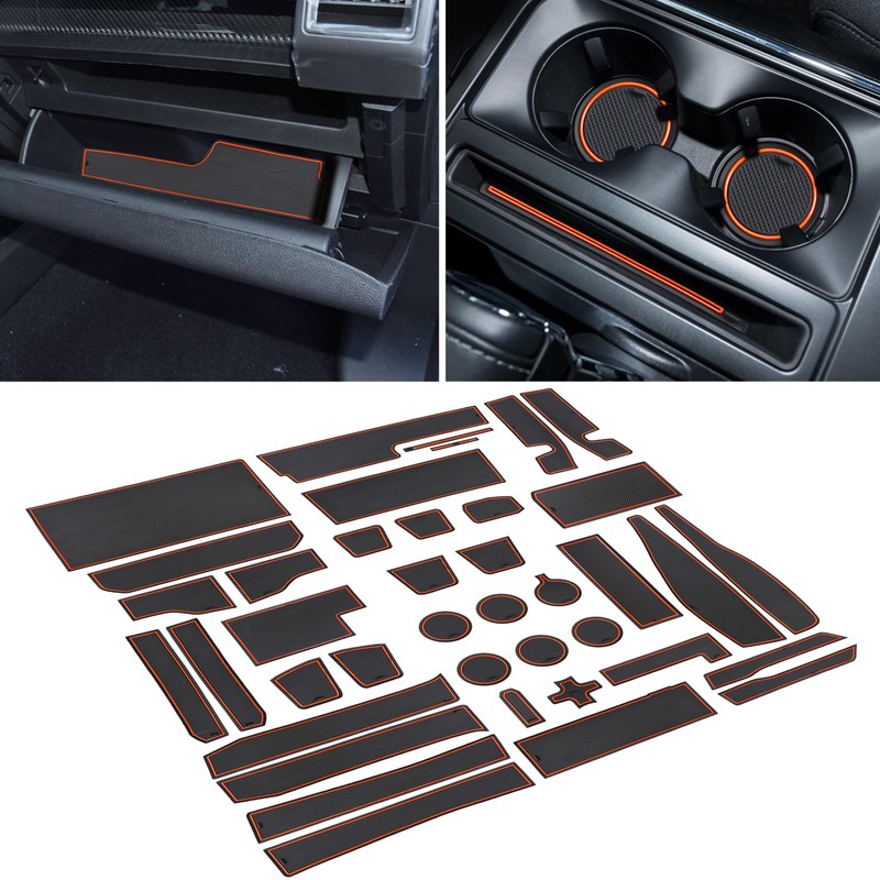 SENSHINE for Ford F150 Accessories 2021 2022 2023 2024 Non-Slip Anti Dust Cup Holder Insert Center Console Liner Trim Door Packet Mats Premium Custom Interior 40-pc Set (Bucket SuperCrew)(Orange Trim)