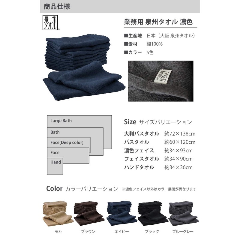 - [Face Towel 10 Towel Set] Made in Japan (Senshu Towel); Material: 100 % cotton; Size/Weight: (approximate) 13.4 x 37.6 inches (34 x 94.5 cm), 2.4 ounces per dozen (220 monme); Colors: black, navy, brown, blue - gray, mocha; Set Contents: 10 face towels.