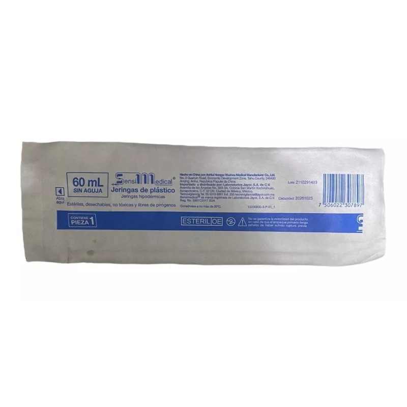 Jeringa Estéril Desechable 60 Ml Sin Aguja DESCRIPCIÓN TÉCNICA Jeringa de 60 ml S/aguja Graduada. Pivote Luer Lock. Embolo reforzado con doble anillo. Barril transparente. Bisel para fractura. ESPECIFICACIONES Fabricada a base de polipropileno grado médico. Capacidad: 60 ml. IDEAL PARA Permite administrar al organismo cualquier medicamento líquido por debajo de la piel, en forma directa o indirecta con fines terapéuticos o de diagnóstico. BENEFICIOS Fabricada con materiales de alta calidad y resistencia. Su graduación no se borra y permite administrar la cantidad correcta. El barril transparente permite visualizar claramente el contenido. El pivote Luer Lock logra un perfecto engranaje entre la aguja y la jeringa. Embolo reforzado que evita el escurrimiento y garantiza una aplicación uniforme. Bisel para fractura evita su reusó y peligro de infecciones por contaminación.