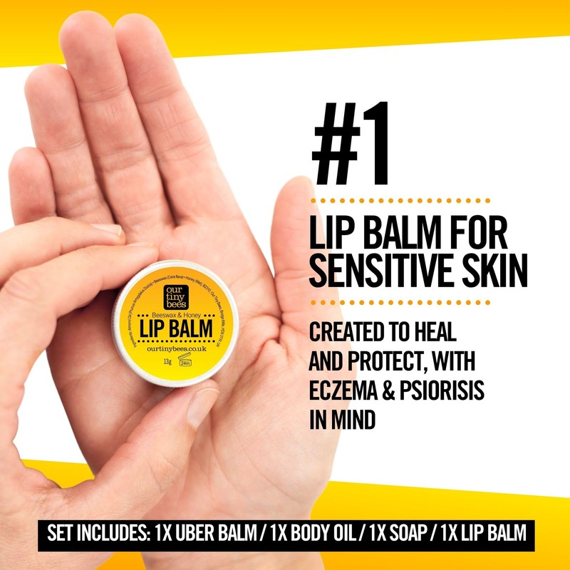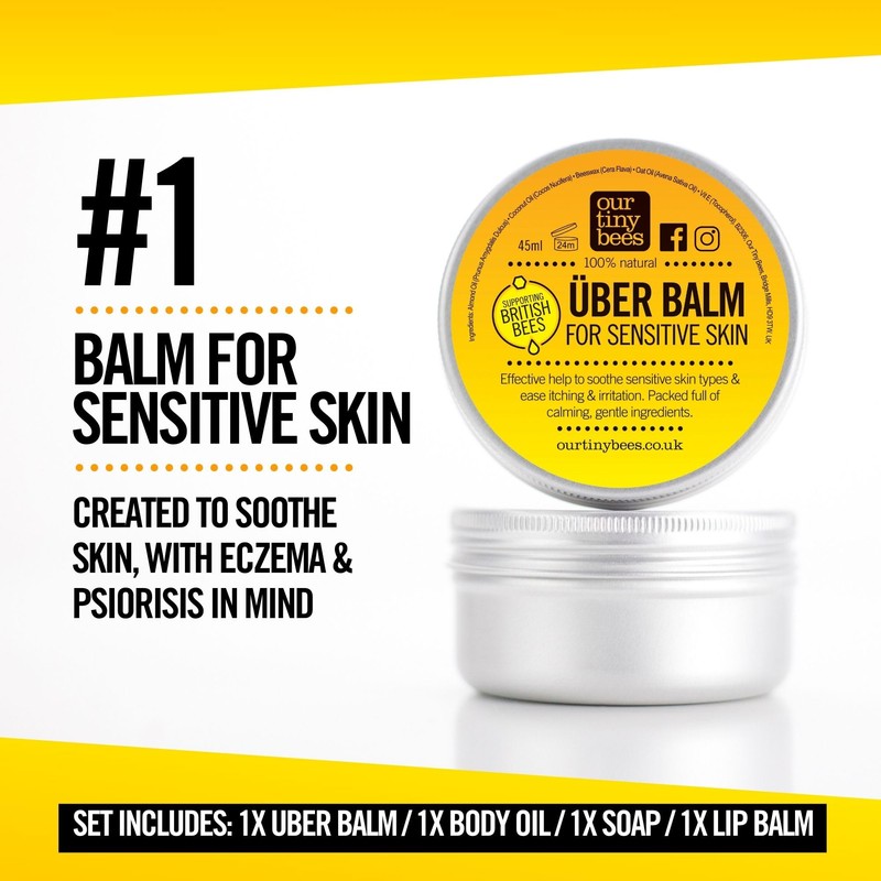 Unlock the secret to soothing sensitive skin with our specialised eczema skincare set. Formulated with gentle, nourishing ingredients, this comprehensive collection provides much-needed relief for those struggling with eczema or other skin conditions. The set includes a gentle, fragrance-free soap that gently removes impurities without stripping the skin's natural oils, a rich, creamy moisturiser Uber Balm that deeply hydrates and soothes irritation, and a nourishing body oil that locks in moisture for long-lasting comfort. Finally a lip balm for healing and protecting lips or any other areas. Specially designed for delicate skin, this set helps alleviate dryness, itching, and inflammation, leaving your skin feeling calm, soft, and rejuvenated. Embrace a soothing skincare routine tailored to your sensitive skin's unique needs.
