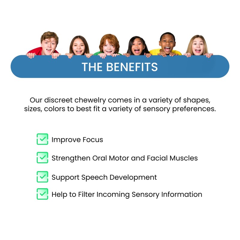 - Promotes attention and focus: Our chews provide a calming and focusing response, which can improve self-regulation, is ideal for children who tend to chew on items when seeking increased oral sensory input.