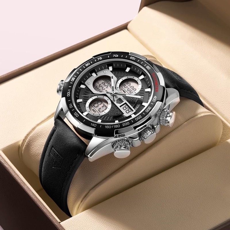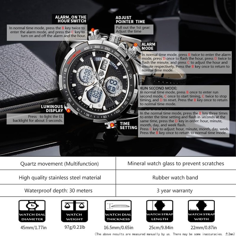 • 【𝐌𝐮𝐥𝐭𝐢-𝐟𝐮𝐧𝐜𝐭𝐢𝐨𝐧】The watch with chronograph running seconds/day/month/week/alarm clock/hourly reporting/----More accurate time. More stable. The alarm function can effectively remind you never miss important events.