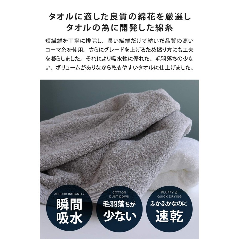 • (Cotton yarn developed for towels) Carefully eliminate short fibers, and use high quality combed yarn that is spun with only long fibers. Furthermore, we twist the way to increase the grade. In addition, this towel has excellent water absorption, low lint and is voluminous yet easy to dry