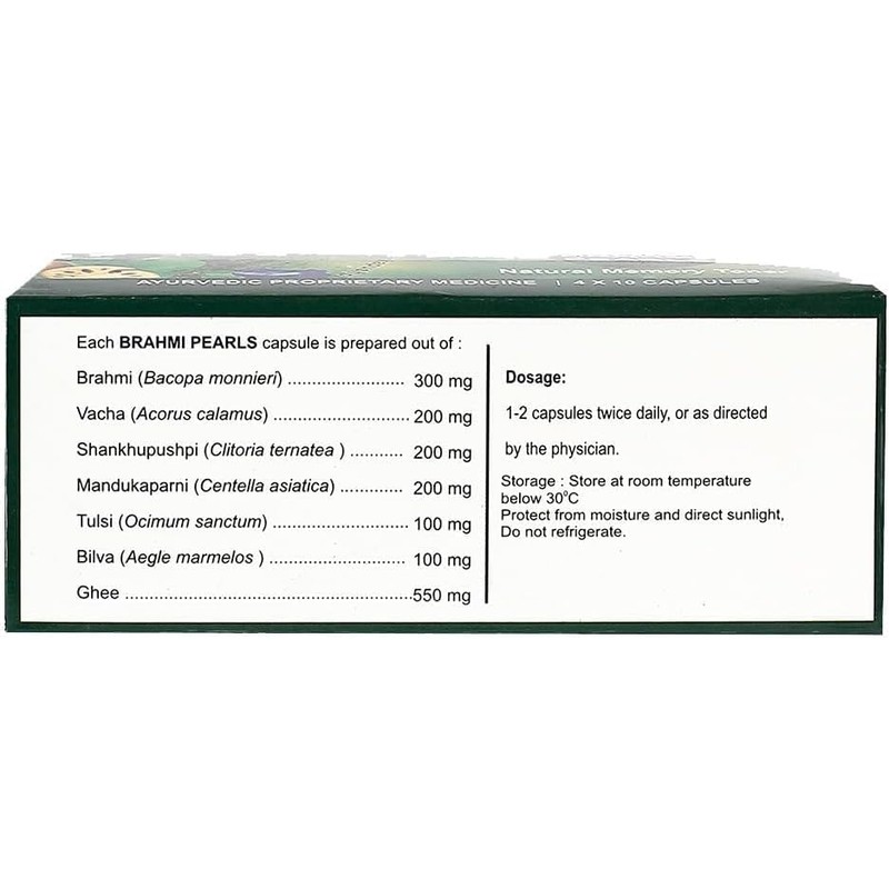 - Ayurvedic Brahmi Pearls 40 Capsules,Supports Memory & Concentration,Enhances Reasoning & Grasping Power,100% Ayurvedic Brahmi Capsules,with Brahmi,Madukaparni,Shankhupushpi,Tulsi in a Ghee Base